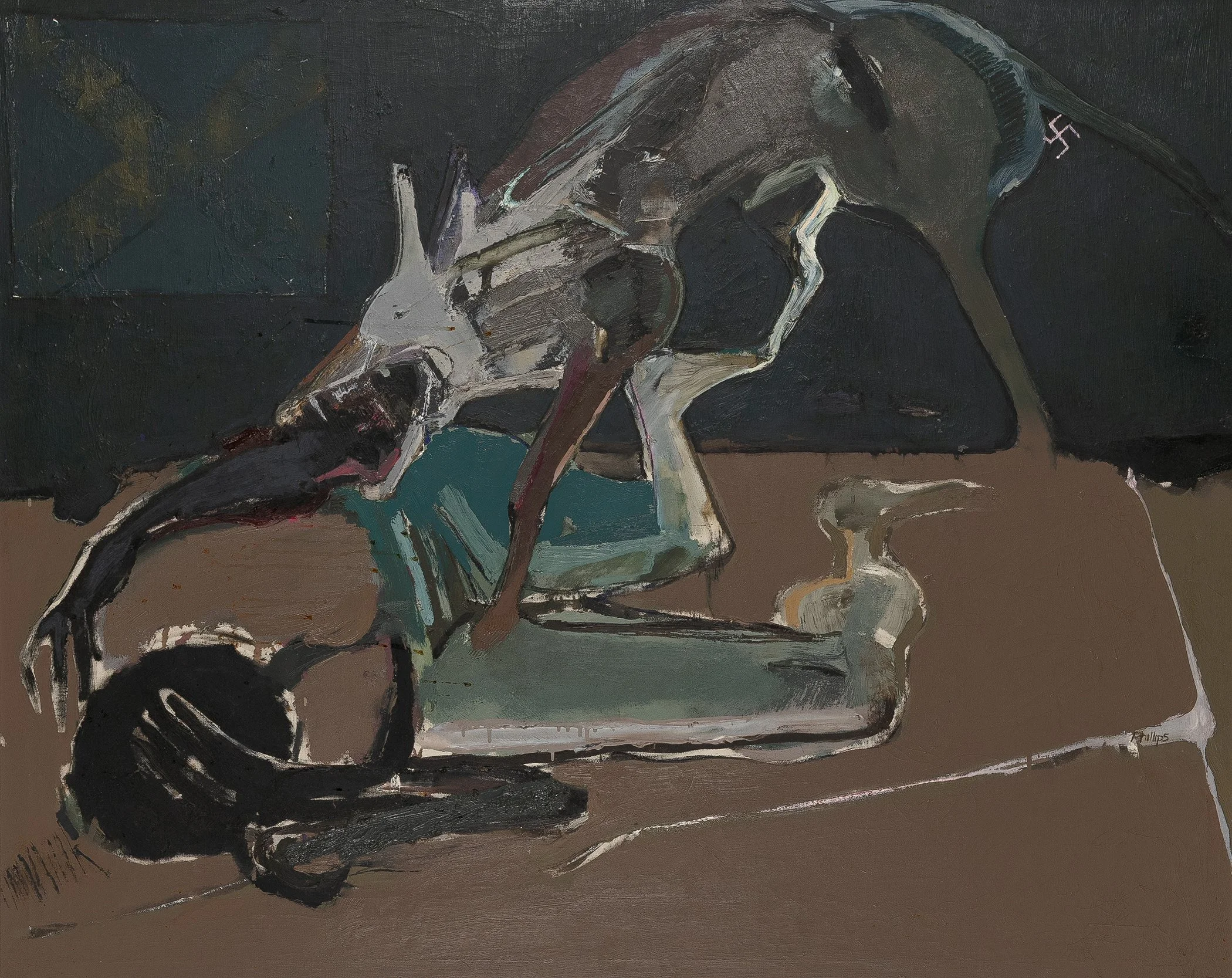 In 1962, Phillips was drafted into the U.S. Army. When he returned, the Civil Rights Movement was reaching a fever pitch, profoundly shaping his worldview and his art. His paintings of the period, such as the one shown here, grapple with themes of violence and oppression, bearing witness to the tumultuous era. Determined to see events firsthand, Phillips traveled to New Orleans, Selma, and Mississippi. The day before his departure, Malcolm X was assassinated. On his arrival in Selma, he witnessed the first March to Montgomery led by C. T. Vivian, an event marked by the brutal attack on marchers and the murder of Jimmie Lee Jackson by an Alabama state trooper. As Phillips later recalled: