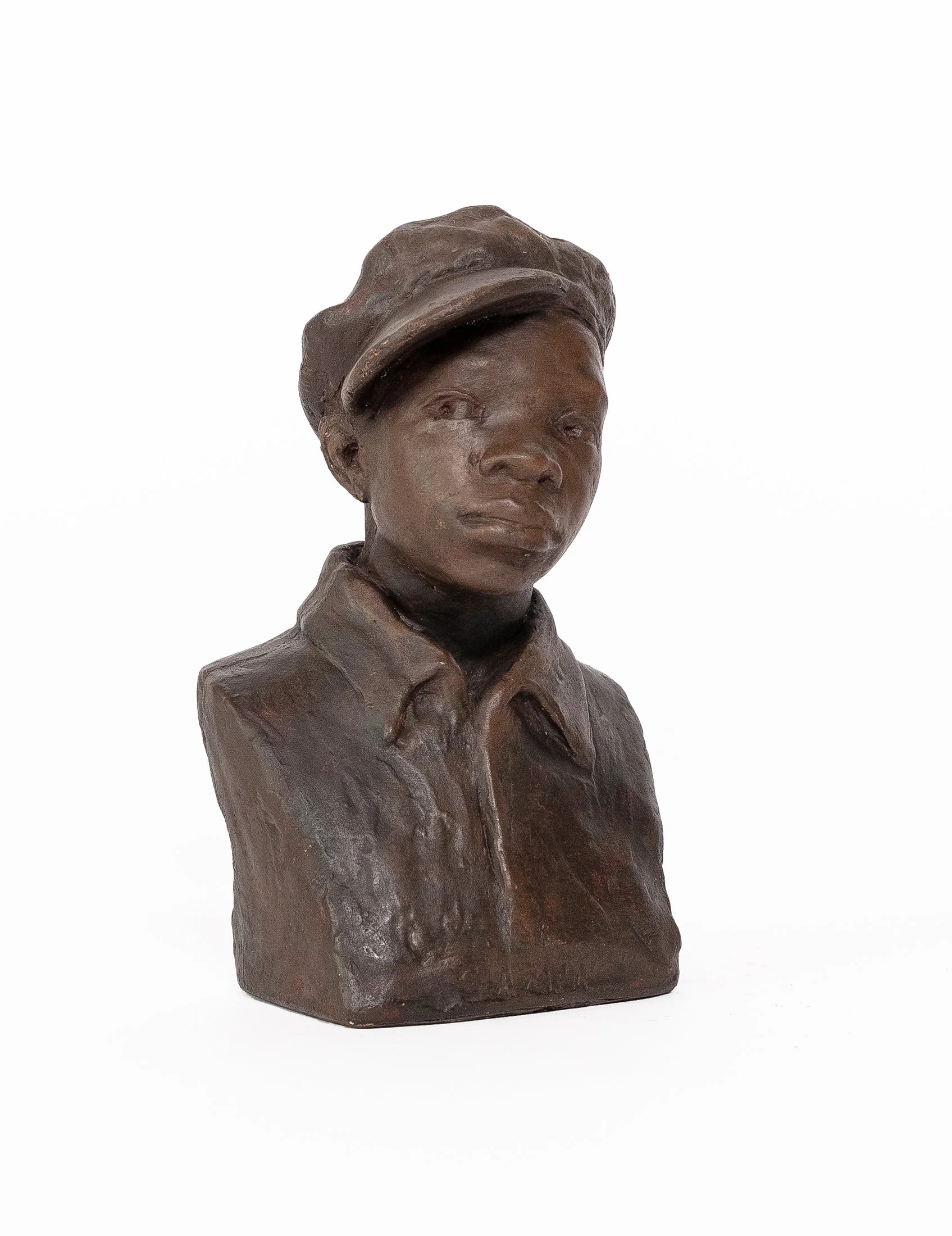 Gamin (1929) by Augusta Savage sits somewhere between the political and the mundane. Savage worked during the Harlem Renaissance; some might argue she was one of the chief architects of the movement, which actively proliferated portrayals of Black people that were positive to counteract the lascivious nature of minstrel stereotypes. The name comes from the French term etched onto the bottom of the sculpture, which means “streetwise” in French. (6) It depicts the artist’s nephew in a newsboy hat, evidence of a working Black youth, decidedly urban yet productive. His eyes, caught in medias res, are in the direction of his head, cocked to the side slightly, radiating effervescent cool.