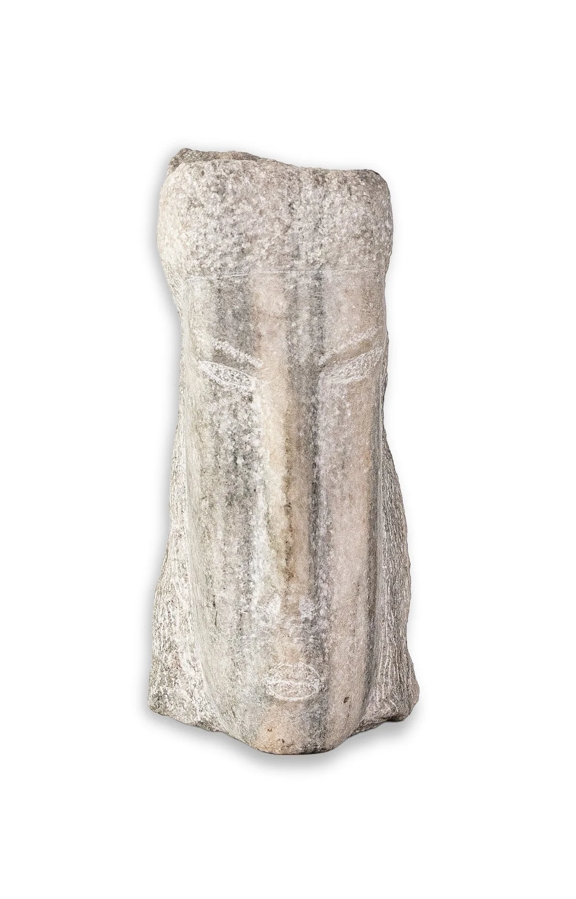 The two works by Perkins are carved stone, often seen as the medium of permanence and importance from a personal and societal perspective. For example, the head of his wife was not the only one of his kind, as there is another record of a similar object in the collection of the Art Institute of Chicago. For the artist, he memorializes his wife by recreating her face, which has rounded features: arched eyebrows, oval-shaped eyes, prominent cheeks, and a rounded mouth with added carving framing the face to create her hair. The Untitled work is carved out of marble, which has Classical Greco-Roman and Egyptian connotations. Instead of this work having a name, it is as if he is creating his own relic, echoed in the exaggerated, elongated, and mask-like features. He also undoubtedly draws from the visual culture of heads that were prominent as ways of honoring ancestors in West Africa, especially among royals in Benin and nobles in the Akan Empires.