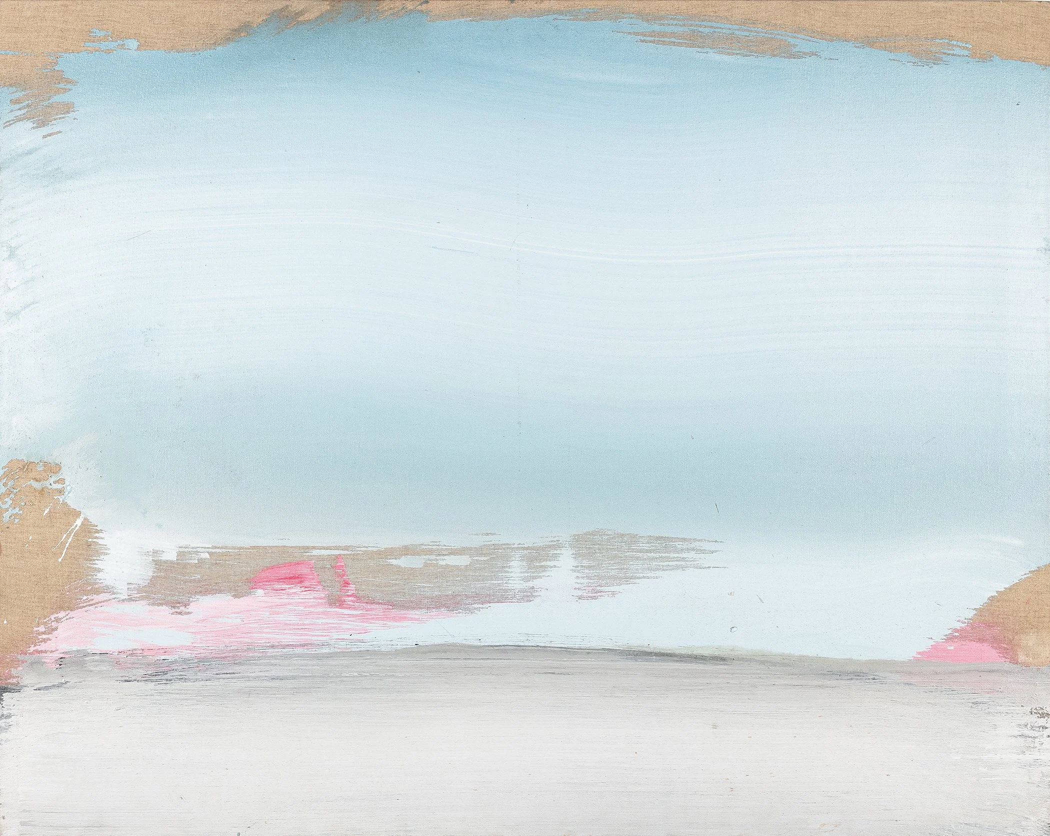 Returning to New York, Clark had a solo show at the artist-run Brata Gallery in 1957 and continued exhibiting there through 1959. As Pop Art rose in the 1960s, his brand of abstraction received less attention in the U.S., prompting renewed periods in Paris; a one-person exhibition at Galerie Creuze followed in 1966. In the same decade, he began using a push broom to drive paint across canvases laid on the floor, an innovation that produced sweeping, horizon-scale strokes. Clark would go on to develop elliptical formats, shaped supports, and draped canvases, all aimed at freeing the image from the strict rectangle. Early exposure to Monet’s Water Lilies left a lasting imprint on his approach to light, color, and immersive scale.
