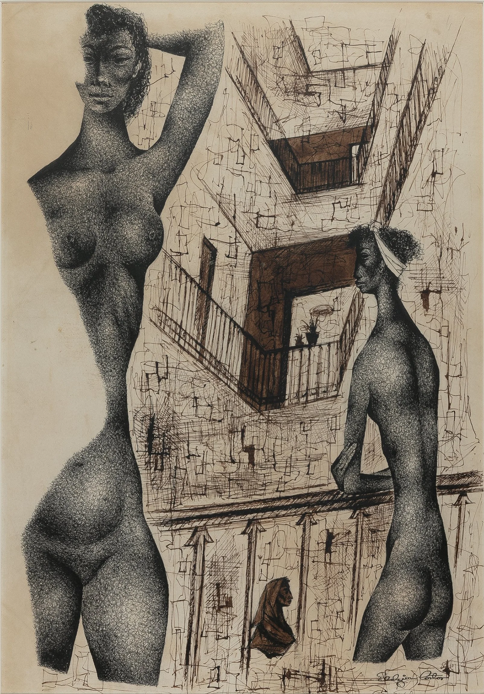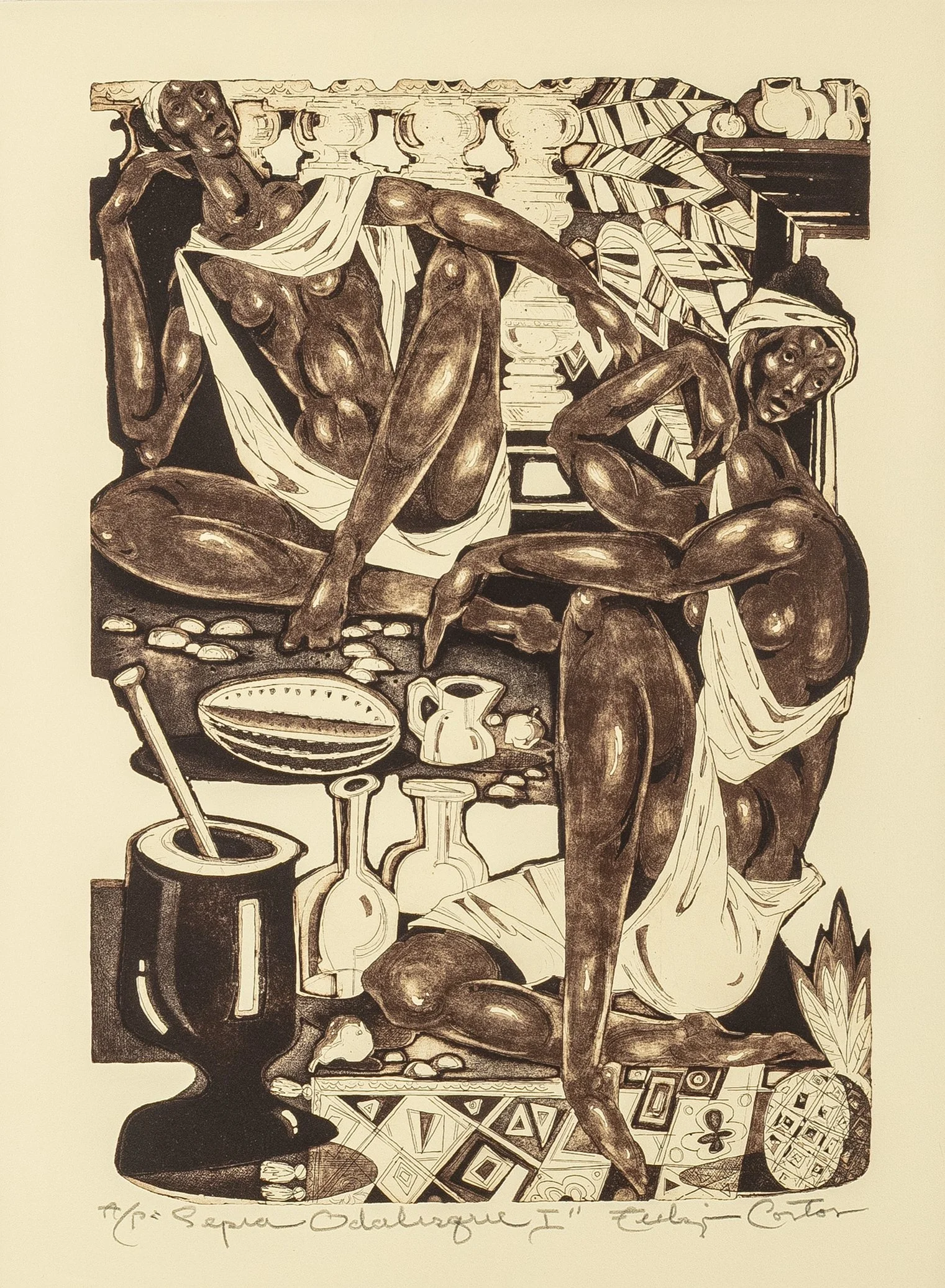 Eldzier Cortor devoted his long career to portraying the dignity, resilience, and beauty of African American life, with a particular emphasis on the Black female figure. Born in Richmond, Virginia, and raised in Chicago, he studied at the Art Institute of Chicago, where he was first inspired by African sculpture on view at the Field Museum. That encounter shaped a modernist style rooted in African form and symbolism, which he fused with a deeply personal vision of cultural identity.