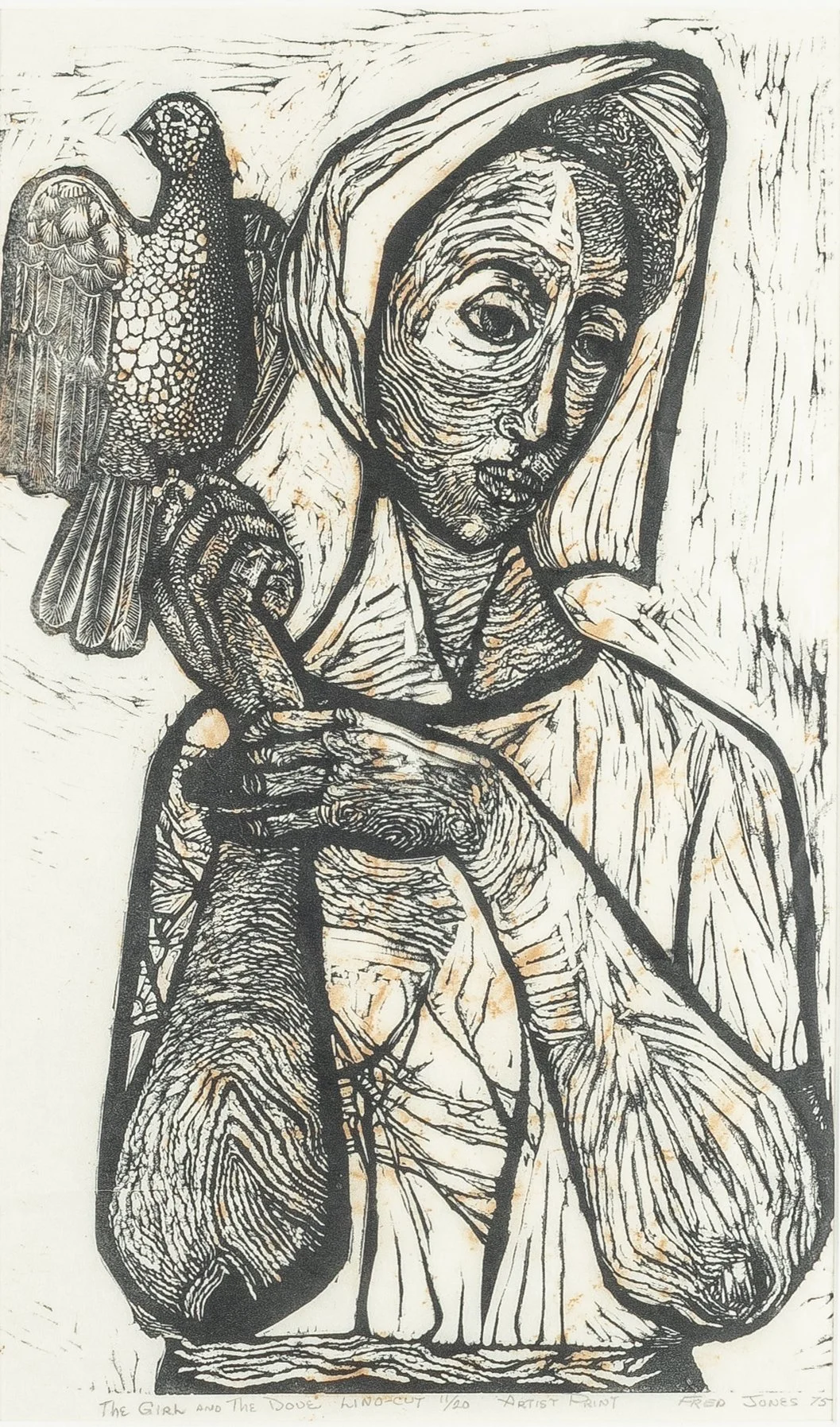 Jones’s work is a remarkable synthesis of elements and influences that he was exposed to throughout his life, as well as an innate sense of design and sensitivity to his subjects. His indelible style was shaped first at Morehouse and Spelman Colleges and Clark Atlanta University in Atlanta, Georgia. During this time, Hale Woodruff took him under his wing, along with fellow artist Wilmer Jennings. Jones was one of the lucky students who Woodfuff selected to assist him with murals for Talledega University.