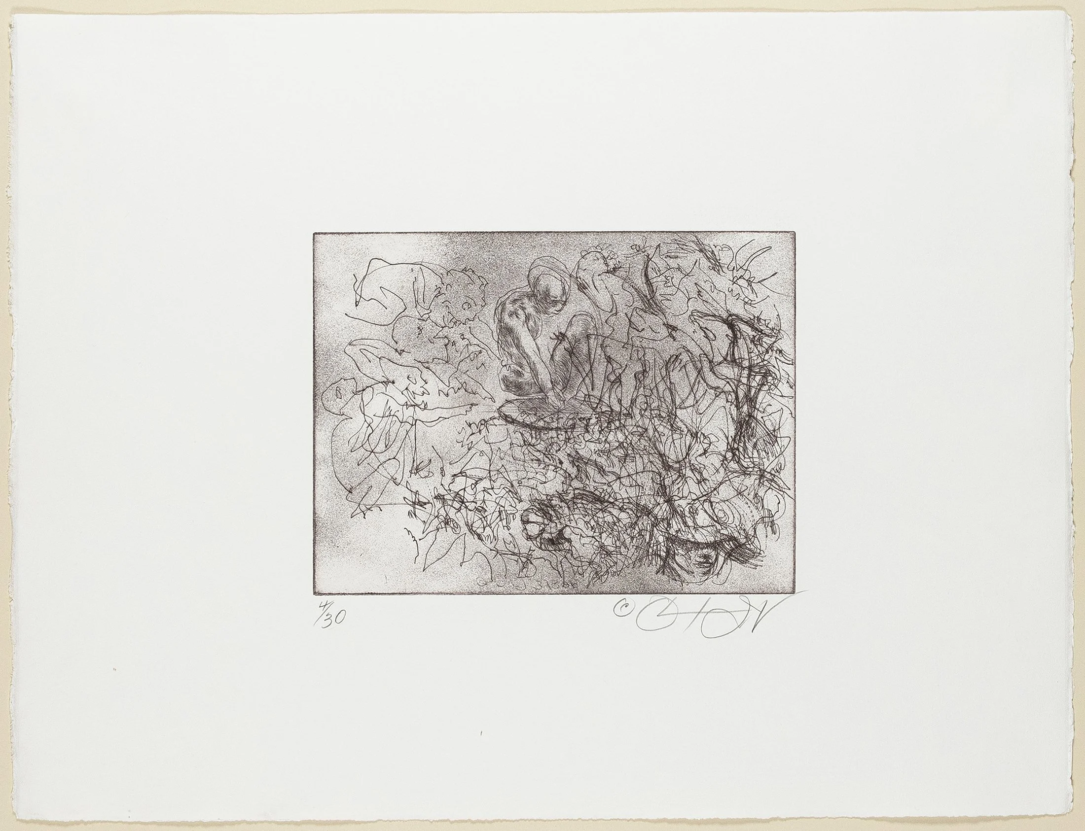 Over a six decade long career Oliver Jackson (b. 1935) has produced paintings, sculptures, and works on paper grounded in the figure but also deeply rooted in the abstract and the improvisational spirit of jazz. The intaglio print offered in this collection is an excellent example of the tension between chaos and coherence that Jackson’s work typifies. Half-formed figures appear only briefly amid a maelstrom of gestural marks, unable to escape the chaos contained within the frame.