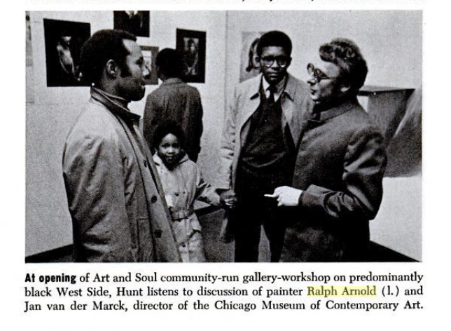 Arnold served the South Side Community Art Center as a board member, donor to its annual auctions, and frequent exhibitor, including the 1973 solo show Some Old and Some New. Arnold taught at Hyde Park Art Center, Rockford College, Barat College, and Loyola University, Chicago, where he chaired the Fine Arts department. In 2006, the Ralph Arnold Gallery was established at Loyola in his memory as a part exhibition/part workspace in tribute to his advocacy for the arts