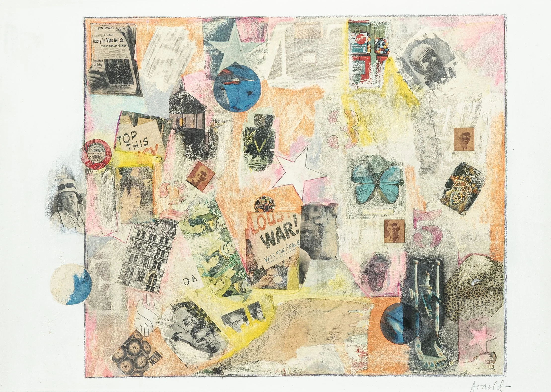 Arnold’s compositions move between the documentary and the abstract, using photojournalistic images of Black life and culture with typographic fragments and abstract expressionist devices to build what critic (and fellow artist) Keith Morrison called “abstract narratives about life in his time.” His work was exhibited in the early 1960s at the Hyde Park Art Center, and he was represented in Chicago by Benjamin Galleries from 1964 to 1969, Gilman Galleries, and Van Straaten Gallery, all in Chicago, which held solo exhibitions in their respective spaces.