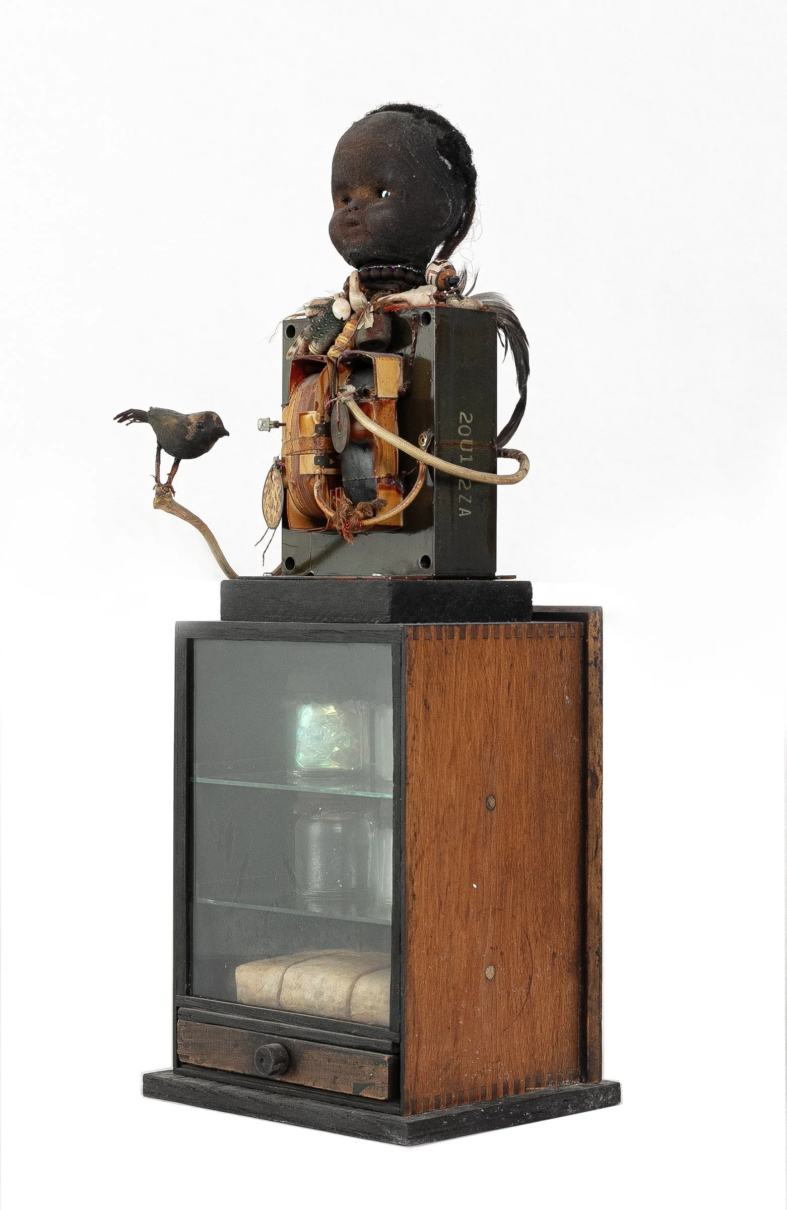 The sculpture features a child’s doll head atop a cabinet filled with jars, talismans, and a perched bird. Like Cornell, Stout creates a theatrical stage within a box, a site where objects carry symbolic weight beyond their humble origins. Yet, while Cornell’s boxes often evoke nostalgia, Stout’s are steeped in ritual power: shells, beads, and worn materials evoke traditions of Kongo minkisi, Hoodoo, and conjuring practices. The work becomes less a dreamscape than a shrine, simultaneously honoring an artistic predecessor and reclaiming the authority of African-American spiritual aesthetics within modern assemblage.