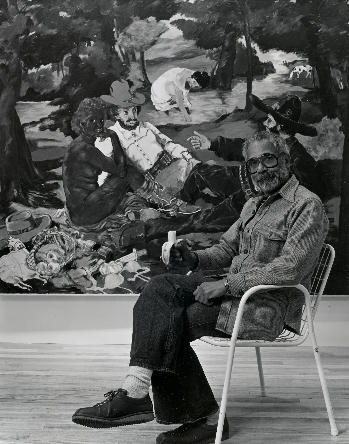 By the 1970s, Colescott had developed the highly charged, narrative-figurative style for which he became celebrated. His re-imagined “Old Master” paintings, such as Eat Dem Taters (1974) and George Washington Carver Crossing the Delaware (1975), satirized canonical art history by inserting Black figures into Eurocentric narratives, exposing the racialized underpinnings of Western culture and its visual hierarchies. With garish color, exaggerated anatomy, and biting wit, Colescott used humor as both a weapon and a mirror, forcing viewers to confront America’s contradictions around race, beauty, and history.