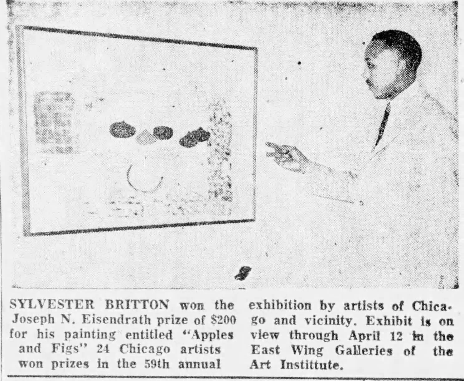 Back in the United States, Britton helped revitalize the South Side Community Art Center, where he served as gallery director, and he exhibited regularly at Chicago’s 57th Street Art Fair. His work appeared at the Oak Park Library (IL), Atlanta University; Art Institute of Chicago; and the South Side Community Art Center. Britton received the Art Institute of Chicago’s Eisendrath Prize in the 59th Exhibition of Artists of Chicago and Vicinity for the oil painting, Apples and Figs. In 2018, the Smart Museum in Chicago included his work in The Time is Now! Art Worlds of Chicago’s South Side, 1960–1980.