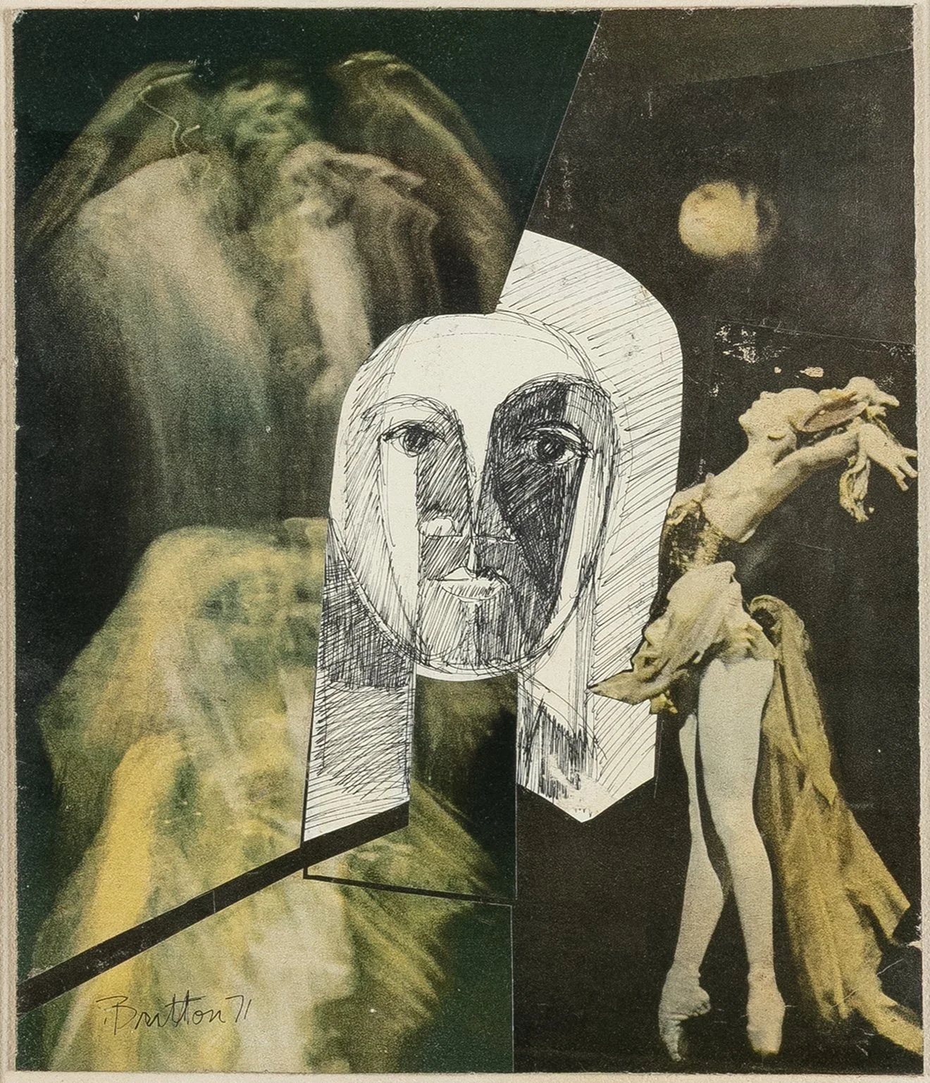 1971; mixed media collage, 12 x 10 inches, signed and dated