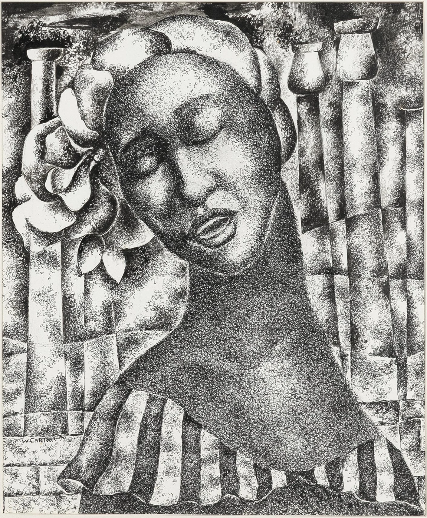 William Sylvester Carter was born in St. Louis, MO and moved to Chicago in 1930 to study art at the School of the Art Institute of Chicago and the University of Illinois. In order to earn room and board, Carter worked as a janitor at the Palette and Chisel Club (an all-white club, to which he became an honorary member in 1986).